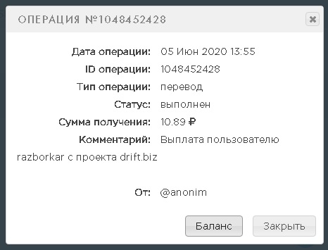 Комментарий: Выплата пользователю dronni0707 с проекта drift.biz
