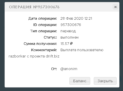 Memo: API Payment. Выплата пользователю Metamorfozzz с проекта drift.