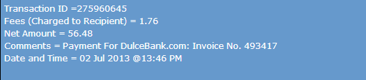 Transaction ID =275955423 *Fees (Charged to Recipient) = 1.90*Net Amount = 62.1Comments = Payment For DulceBank.com: Invoice No. 473365*Date and Time = 02 Jul 2013 @03:31 AM*