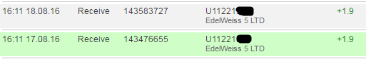 08.18.16 23:01AccountReceive+1.76Received Payment 1.76 USD from account U11221527 to account U9. Batch: 143624926. Memo: API Payment. Withdrawal Edelweiss5 ПЛАТИТ