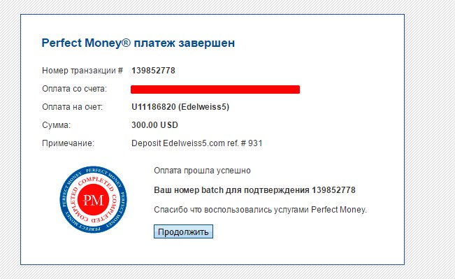 The amount of 1.98 USD has been deposited to your Perfect Money account. Accounts: U11221527->U10. Memo: API Payment. Withdrawal Edelweiss5.com.. Date: 09:42 16.07.16. Batch: 139931390.