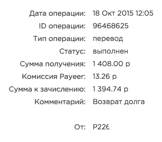 10.18.15 22:13 Account Receive +12.93 Received Payment 12.93 USD from account U9119397 to account U4731311. Batch: 105777378. Memo: Возврат долга elevrus