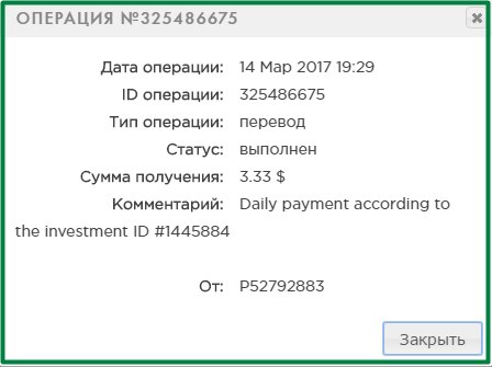 The amount of 0.5 USD has been deposited to your Perfect Money account. Accounts: U13522831->U352**. Memo: API Payment. Daily payment according to the investment ID 1450688.. Date: 11:55 14.03.17. Batch: 168568451.
