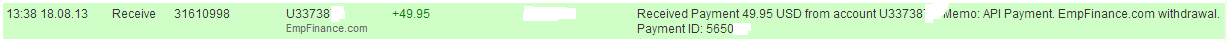 The amount of 34.1 USD has been deposited to your Perfect Money account. Accounts: U3373876->U319***. Memo: API Payment. EmpFinance.com withdrawal.. Date: 17:50 18.08.13. Batch: 31634288.