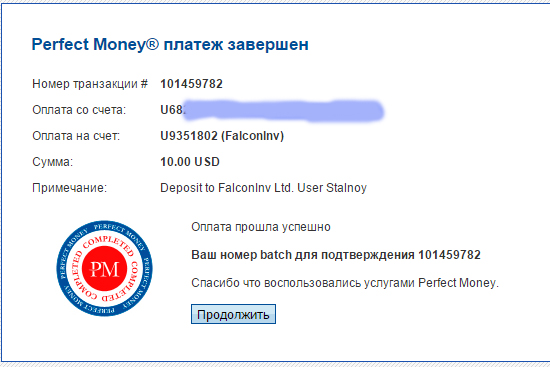 Депчик-The amount of 10 USD has been withdrawn from your Perfect Money account. Accounts: U5517->U9351802. Memo: Shopping Cart Payment. Deposit to FalconInv Ltd. User komissar.. Date: 21:12 09.09.15. Batch: 101455355.