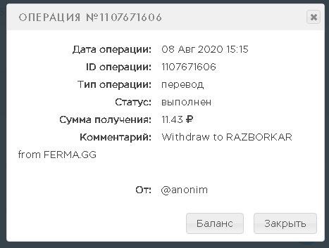 Комментарий: Withdraw to MIROSLAIK from FERMA.GG