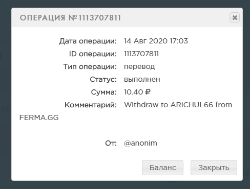 Комментарий: Withdraw to OLEG414 from FERMA.GG
