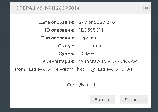 Комментарий: Withdraw to MONIKTOP from FERMA.GG | Telegram chat — @FERMAGG_CHAT