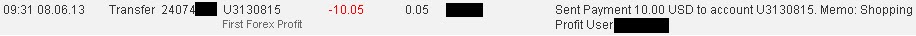 08.06.13 08:07 Transfer Sent Payment: 100.00 USD to account U3130815 from U. Batch: 24070080. Memo: Shopping Cart Payment. Deposit to First Forex Profit User .