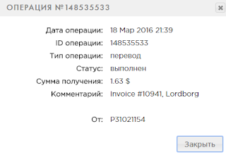 18.03.16 21:48 Receive Received Payment 1.1 USD from account U10063689 to account U11829472. Batch: 124248156. Memo: API Payment. Invoice 11169, SlavDN.