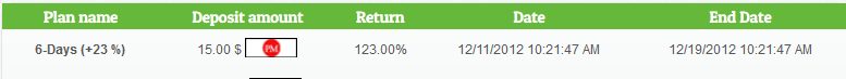 6-Days (+23 %) 15.00 $ 123.00% 12/11/2012 10:21:47 AM 12/19/2012 10:21:47 AM