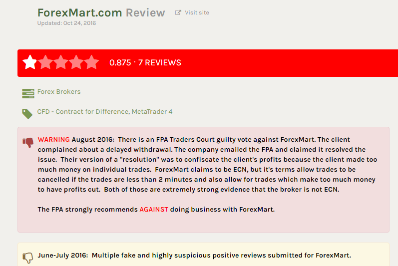 Компания успела уже отличиться на ForexPeaceArmy (_http://www.forexpeacearmy.com/forex-reviews/12358/www.forexmart.com): ужасный рейтинг и уличение в написании фейковых положительных отзывов