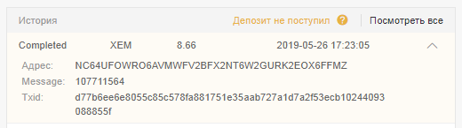 Транзакция ⇒ http://explorer.nemchina.com/#/s_tx...ed49f4cb557a9826b70c42565e7f0bb8ca1aedfc52d8c