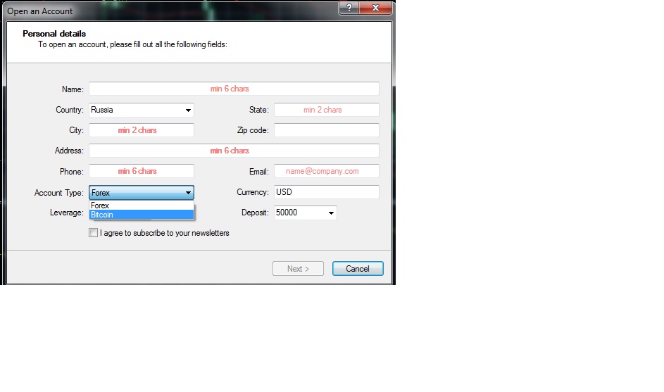 Крипто-счета доступны в демо-версии. Протестировать торговлю по криптопаре BTC/USD можно в терминале MT4 ECN Demo, задав следующие параметры меню: