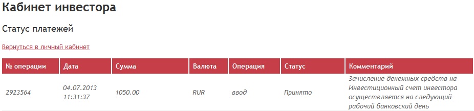 2923564 04.07.2013 11:31:37 1050.00 RUR ввод Принято Зачисление денежных средств на Инвестиционный счет инвестора осуществляется на следующий рабочий банковский день