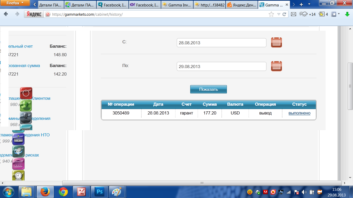 3033556 16.08.2013 16:39:48 96.03 USD вывод В обработке Заявка на вывод гарантированной суммы