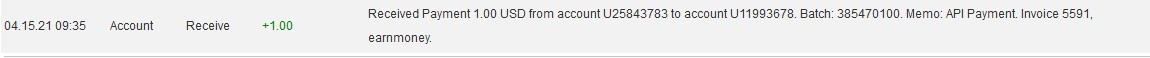 04.15.21 20:53AccountReceive+1.00Received Payment 1.00 USD from account U25843783 to account U11993678. Batch: 385616834. Memo: API Payment. Invoice 6043, earnmoney.