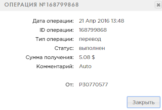 04.20.16 21:10 Account Receive +5.00 Received Payment 5.00 USD from account U10798368 to account U4731311. Batch: 129388203. Memo: API Payment. Auto. Global Market
