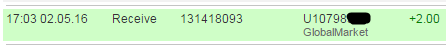 05.05.16 10:21 Account Receive +5.03 Received Payment 5.03 USD from account U10798368 to account U10**. Batch: 131816108. Memo: API Payment. Auto