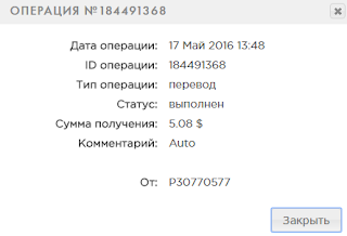 05.19.16 21:08 Account Receive +5.00 Received Payment 5.00 USD from account U10798368 to account U4731311. Batch: 133962306. Memo: API Payment. Auto. Global Market