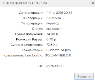 Сумма к зачислению: 16.84 p Комментарий: Выплата 17 руб. пользователю Monitorr от GOLD-MINER.SU!
