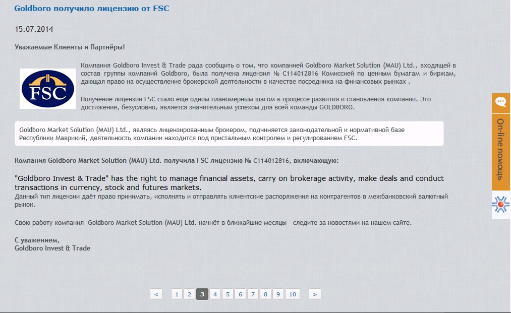 Поддерживаю данный вопрос - знать куда жаловаться, у меня к примеру во вторник выходит пятидневный срок вывода средств - так что вполне можно составлять претензию на GoldBoro, так как заявка была до появления новости о заморозке ввода-вывода средств!Отлично, тогда будет кстати поинтересоваться у регулятора, несет ли он какую-то отвественность перед вкладчиками. Или только в том случае, когда у него возникли подозрения и он может заморозить счета компании. По крайней мере белизский регулятор такое может.