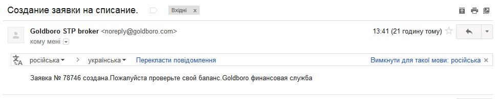 Также мной с утра 29.09.2014 г. - была подана заявка на вывод средств до весьма печальной новости, на что пришел ответ от их фин. службы, но средства так и остались болтаться на балансе GoldBoro!