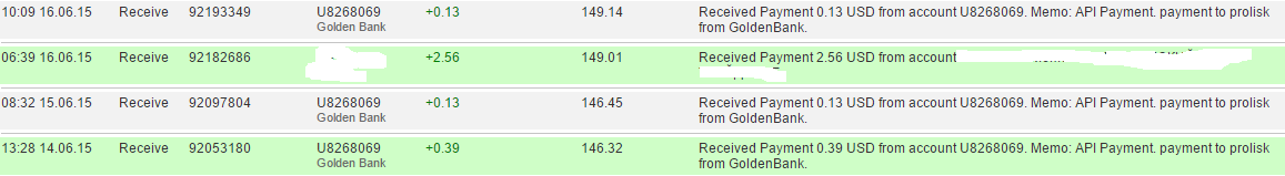 09:58 16.06.15 Receive 92192493 U8268069 +4.52 Received Payment 4.52 USD from account U8268069. Memo: API Payment. payment to ProfitHunters from GoldenBank.