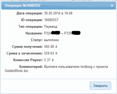 Comment: Выплата пользователю **** с проекта GoldenBirds.biz