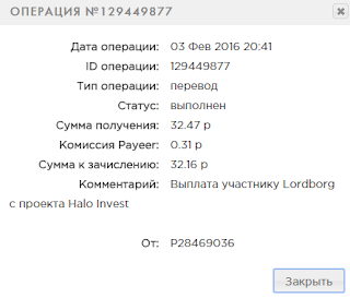 Комментарий: Выплата участнику sarita с проекта Halo Invest