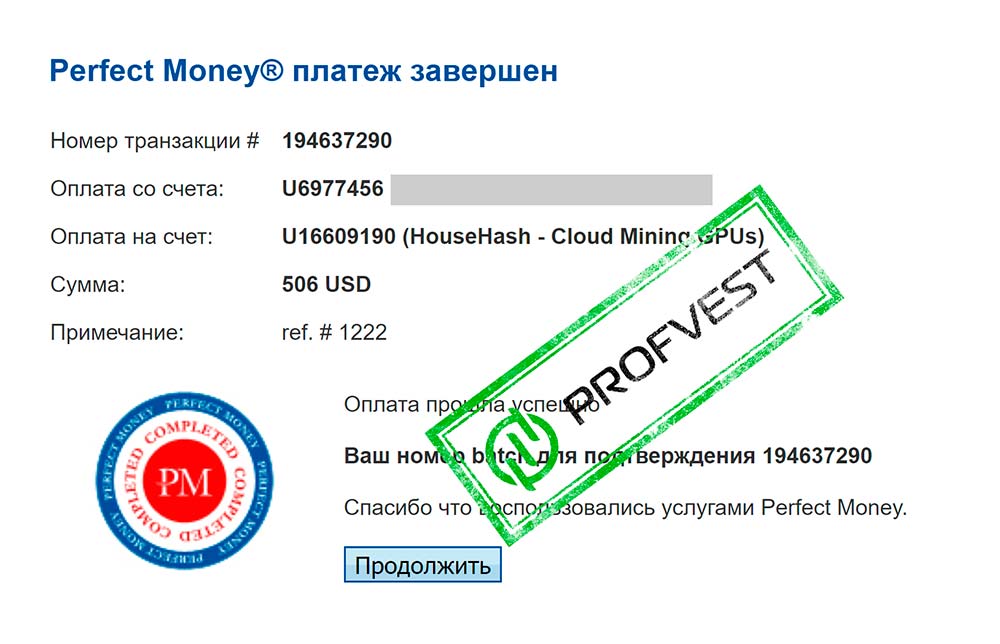 Получатель платежа: HouseHash - Cloud Mining GPUs / househash.com