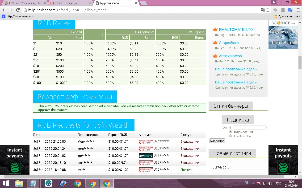 08.07.16 17:54 Received Payment 0.71 USD from account U1993418 to account U7.... Batch: 139172867. Memo: API Payment. HYIP-CRUISER.COM - REFBACK. CHECK YOUR E-MAIL BOX.