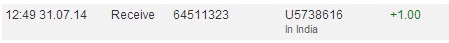 31.07.14 10:53 Received Payment 1.00 USD from account U5738616. Batch: 64502378. Memo: API Payment. Withdraw to rcb-monster.com from In India LIMITED.