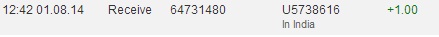 13:01 01.08.14 Receive 64733047 U5738616 In India +2.5 Received Payment 2.5 USD from account U5738616.