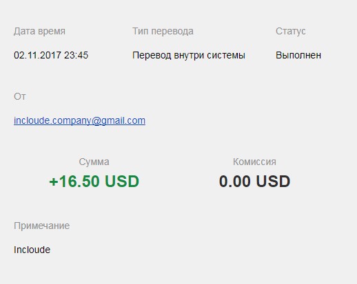 Платит спасибо! The amount of 108 USD has been deposited to your account. Accounts: U14505466->U Memo: API Payment. incloude.com.. Date: 07:30 02.11.17. Batch: 193617879.