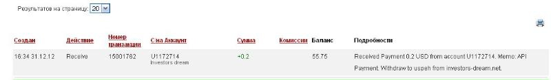31.12.12 16:34 Receive Received Payment 0.2 USD from account U1172714 to account U1472547. Batch: 15001762. Memo: API Payment. Withdraw to uspeh from investors-dream.net.