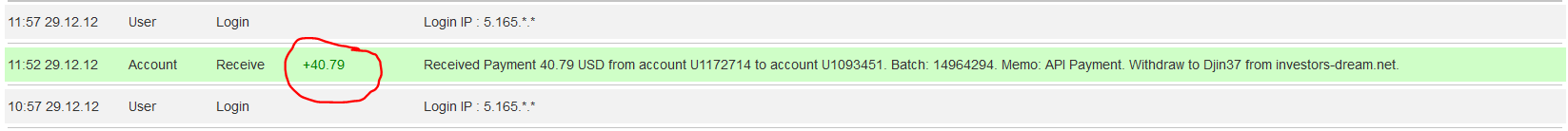 29.12.12 13:19 Receive Received Payment 42.00 USD from account U1172714 to account U1******. Batch: 14965870. Memo: API Payment. Withdraw to ZARITA1 from investors-dream.net.