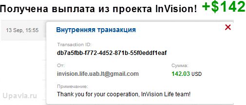 Проект Платит:d-thumbup: 19.09.18 12:17 Receive Received Payment 42.03 USD from account U15519208 to account U*******5. Batch: 228915891. Memo: Thank you for your cooperation, InVision Life team!