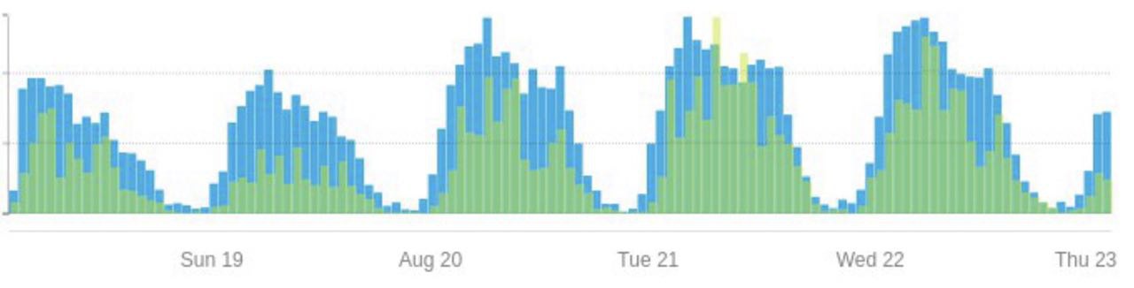 Смотрите, какой интересный график. На нем показано количество регистраций новых клиентов monobank. Синие столбики — Android, зеленый — iPhone.