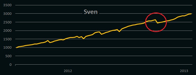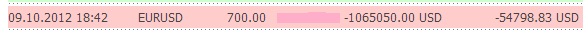neva2012, раз уж Вы анализируете отдельные сделки управляющих, то как относитесь к тому, что Sven в сделку заходит 1-тысячным лотом? Это, как-никак, 100-миллионный объём и каждый пункт "стоит" $10 тыс. Всего 100 пунктов движения, а это очень немного, и миллиона как не бывало, ну или, наоборот, профит. На мой взгляд, применение плеча 1:11 (КУ + КИ примерно 9 млн.) - это очень рискованная торговля. У него, похоже, интуиция отменная, т.к. каждая ошибка может дорого стоить.