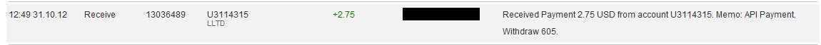 17:38 06.11.12 Account Receive +0.79 Received Payment 0.79 USD from account U3114315 to account U1775***. Batch: 13248135. Memo: API Payment. Withdraw 1601.