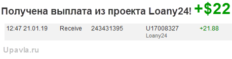 20.01.19 09:34 Receive Received Payment 162.00 USD from account U17008327 to account U74438. Batch: 243310521. Memo: API Payment. loany24.com.
