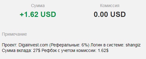 Проект: Digainvest.com (Реферальные: 8%) Логин в системе: MIE63 Сумма вклада: 20$ Рефбэк с учетом комиссии: 1.6$