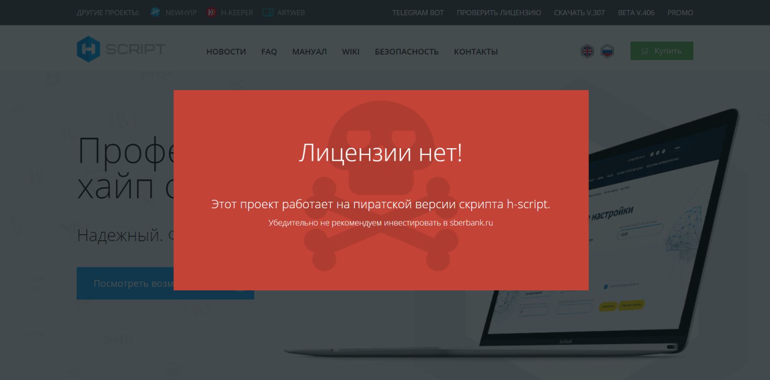 только вчитайтесь в скрине в сказанное я проверял сбер..., он не работает на h-script, но они утверждаю что он херачит на их пиратке, это бред... любой бренд вам это скажет о том что бренд защищается, а то что невозможно защитить физически имеет защиту патентом... Но найдите мне чтобы например самсунг утверждал что сони это подделка самсунга и не покупайте ее!!! я вот о чем говорю. По этому у меня нет оснований утверждать что это h-script и тем более пиратский или нет, скорее скажу что самопис, т.к. при проверке указало на Joomla, а мне известно что в h-script не используют для сборки CMS Joomla. Я не защищаю сайт, это скорее камень в огород разработчиков h-script и при этом это их серьезный недостаток и проблема, которую они почему то решают таким тапорным методом, раздавая советы за бабки... а ведь совет не вкладывать в пирамиды не в какие вообще, является бесплатным и без всяких а вот если с нами поделились то можно! Нельзя, любая такая пирамида с лицухой или без и нагадить на какой CMS построеная ведет к опустошению вашего кошелька и это нужно понимать... а все остальное, является выбором человека, прет иду, не прет, не иду, я игрок, заинтересовало пришел, вижу азарт в этом я тут, скучно, меня нет. Николай, вы же уже тут дед с бородой на форуме и все это знаете как и я, молодым надо вносить это в голову, а мы обычно для них загадки создаем и между собой письками меримся