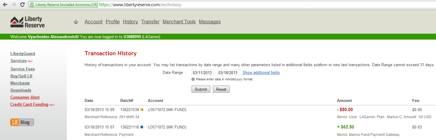 The amount of 51.5 USD has been deposited to your Perfect Money account. Memo: API Payment. Markov Fund Payment Gateway.. Date: 03:31 18.03.13. Batch: 19211140