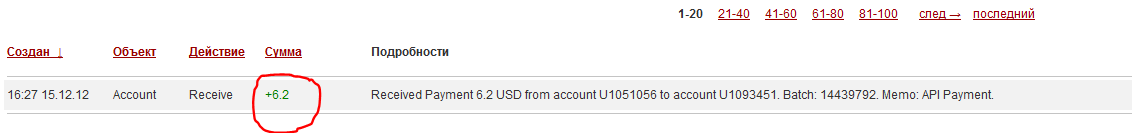 18:28 15.12.12 Account Receive +20.1 Received Payment 20.1 USD from account U1051056 to account U1093451. Batch: 14443495. Memo: API Payment.