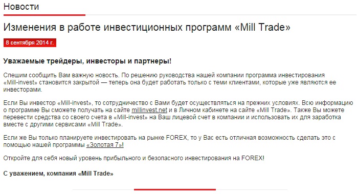 От закрытия "Милл-инвеста" я лично ничего не потерял, так как с самого начала инвестирую только в "золотую 7" . Если посмотреть историю за все периоды-то "7" имеет намного большею доходность, так как тут были и по 10-12% в месяц.