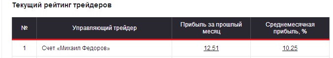 Согласен - но давайте рассмотрим того же счет Михаила Федорова:Так не бывает такого что один и тот же трейдер месяц в месяц по 11% делает, индекс он - среднее арифметическое- и поэтому более стабильнее- возьмите историю золотой 7 с милки за последниэ пол года- ни одного месяца в - и ни одного с % доходностью меньше 7 (хотя были из 7 трейдера сделавшие 3% в месяц- их перекрыли- те кто 12% сделал)