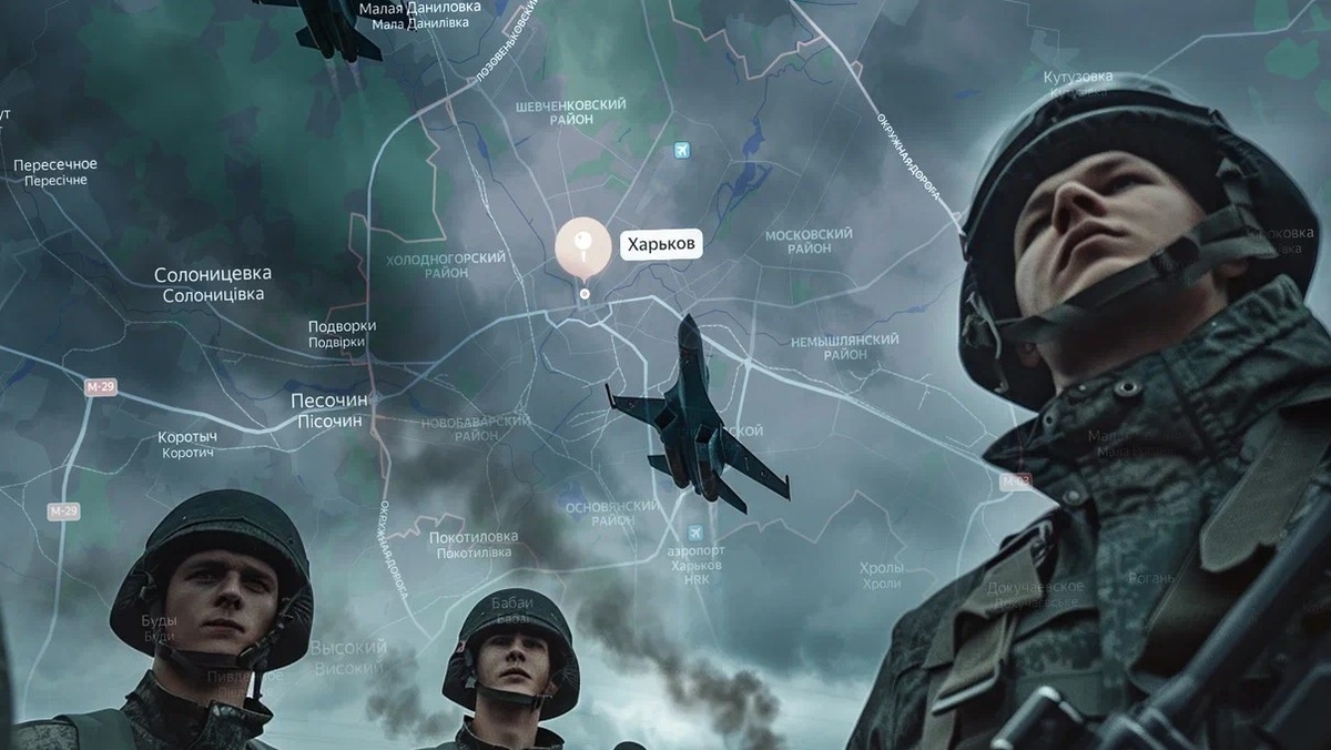 Обратим внимание на каски и типично немецкие лица на фоне карты, как во времена нападения Вермахта, когда это всё точно так же выглядело