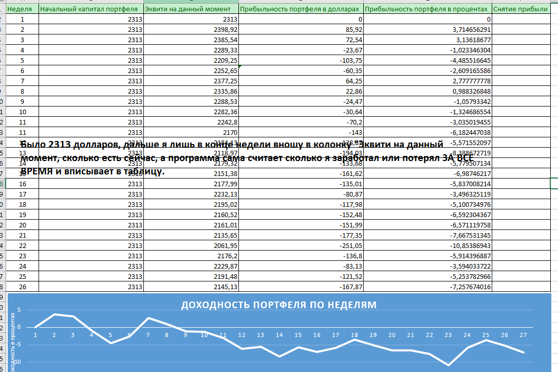 Полагаю, что там идет цифра не за отчетный период, а нарастающим итогом. Хотя да, все равно колонки "прибыльность портфеля в долларах" и "эквити на данный момент" как-то не сходятся. Ну автор пояснит, я думаю.И да, я конечно не доктор, но в таблице у вас не все гладко. Просто эквити и размер убытка не стыкуются вообще. Я просто подбил колонку прибыль и получилось что по всем неделям убыток составляет -2404 доллара. Как при этом у вас эквити почти не меняется не понятно. Это так к слову.
